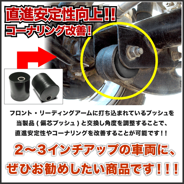 2〜3インチアップの車両に、ぜひお勧めしたい商品です!![ 使用例 ]■3インチUPまでは左右リーディングアームの前側ブッシュ(計2個)の交換をお薦めします。