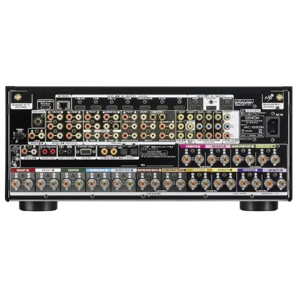 仕様搭載パワーアンプ数:13ch定格出力:150W+150W(8Ω、20Hz 〜 20kHz、THD 0.05%、2ch駆動)実用最大出力:260W(JEITA: 6Ω、1kHz、THD 10%、1ch駆動)適合インピーダンス:4〜16Ω周波数特性:10Hz〜100kHz(+1,-3dB、ダイレクトモード時)S/N比:102dB(IHF-A、ダイレクトモード時)無線LANネットワーク種類(無線LAN規格):IEEE 802.11a/b/g/n準拠(Wi-Fi準拠)セキュリティ:WEP 64bit、WEP 128bit、WPA/WPA2-PSK(AES)、WPA/WPA2-PSK(TKIP) 無線周波数:2.4GHz/5GHzBluetoothバージョン:3.0+EDR対応プロファイル:A2DP1.2、AVRCP1.5対応コーデック:SBC周波数帯域/送信出力/通信距離:2.4GHz帯域/Class 1/約30m(見通し距離)HDMI端子入力:8(リア×7、フロント×1)出力:3(モニター×2、ゾーン2×1)(4K、HDCP 2.2、BT.2020、HDR10、Dolby Vision、HLG、3D、DeepColor、x.v.Color、Auto Lip Sync、ARC、eARC、CEC)アナログ映像入出力端子入力:コンポジット入力×4、コンポーネント入力×3出力:コンポジット出力×2(モニター×1、ゾーン2×1)、コンポーネント出力×1音声入出力端子入力:アナログ音声入力×7、フォノ入力×1、7.1ch入力×1、光デジタル入力×2、同軸デジタル入力×2出力:15.2chプリアウト×1、ゾーンプリアウト×2、ヘッドホン出力×1その他の入出力端子:Denon Link HD×1、Network×1、フロントUSB端子×1、リアUSB端子×1(5V/1.5A給電専用)、Wi-Fi/Bluetoothアンテナ端子×2、セットアップマイク入力×1、RS-232C×1、DCトリガー出力×2、リモートコントロール(IR)入出力×各1外形寸法(フット、端子、つまみ、アンテナを含む)アンテナを立てた場合:(幅)434×(高さ)259×(奥行)482mmアンテナを寝かせた場合:(幅)434×(高さ)195×(奥行)482mm質量:23.3kg消費電力:900W待機電力0.1W(通常スタンバイ)0.5W(CEC スタンバイ)付属品:かんたんスタートガイド、CD-ROM(取扱説明書)、リモコン、単3形乾電池×2、セットアップマイク、マイク スタンド、Wi-Fi/Bluetoothアンテナ×2、ケーブルラベル、電源コード発売時期2018年2月