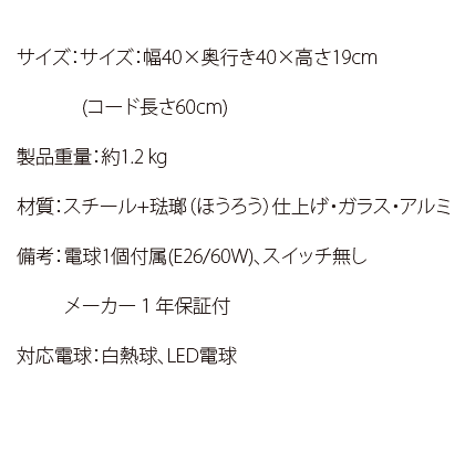 サイズ: 幅40×奥行き40×高さ30.5cm(コード長さ60cm) 製品重量: 約1.2 kg 材質: スチール+琺瑯(ほうろう)仕上げ・ガラス・アルミ 備考: 電球1個付属(E26/60W)、スイッチ無し、メーカー1年保証付 対応電球: 白熱球、LED電球