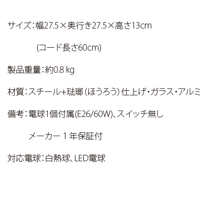 サイズ: 幅27.5×奥行き27.5×高さ13cm(コード長さ60cm) 製品重量: 約0.8 kg 材質: スチール+琺瑯(ほうろう)仕上げ・ガラス・アルミ 備考: 電球1個付属(E26/60W)、スイッチ無し、メーカー1年保証付 対応電球: 白熱球、LED電球