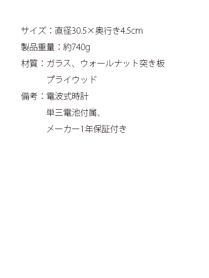 サイズ: 直径30.5×奥行き4.5cm 製品重量: 約740g 材質: ガラスウォールナット突き板プライウッド 備考: 電波式時計単三電池付属メーカー1年保証付き